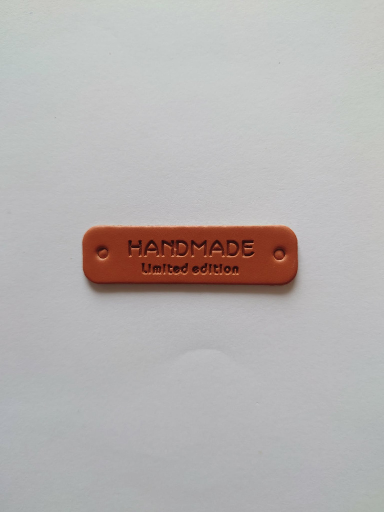Merkelapp med teksten Handmade limited edition, laget av kunstskinn.