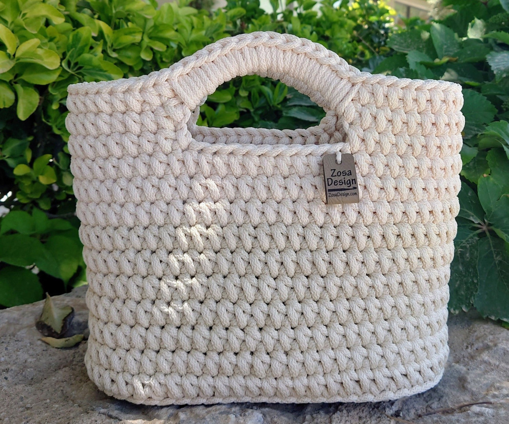 Størrelse på vesken du skal lage er ca 23 cm høy og 29 cm bred (avhengig av heklefasthet og valg av heklesnor).